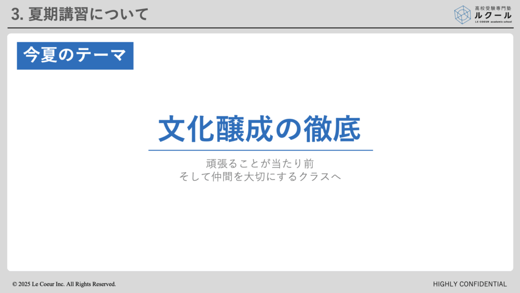 そんな想いから、2025年の夏期講習テーマを「文化醸成の徹底」とした。