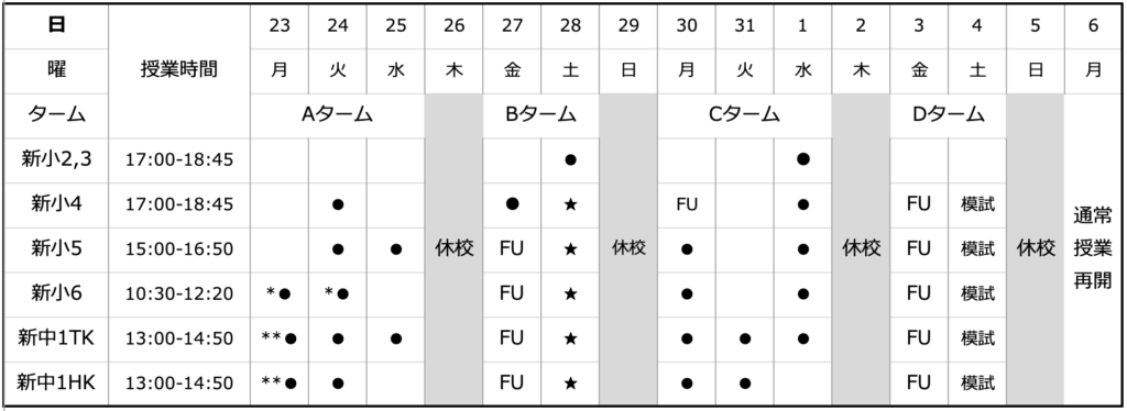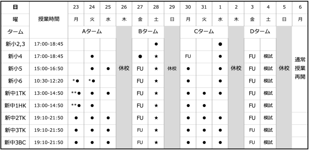 23日、24日はまだ学校があり、新小学6年生の授業日時と被るため授業時間を調整させていただきます。(それに伴い新中1の日程も変更しております)